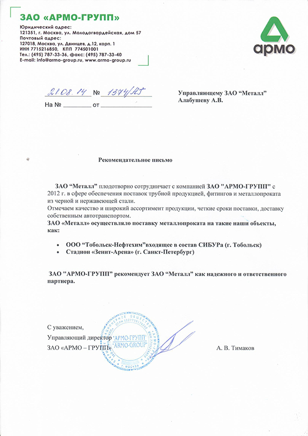 ЗАО "Металл" плодотворно сотрудничает с компанией ЗАО "АРМО-ГРУПП" с 2012г. в сфере обеспечения поставок трубной продукции, фитингов и металлопроката из черной и нержавеющей стали.